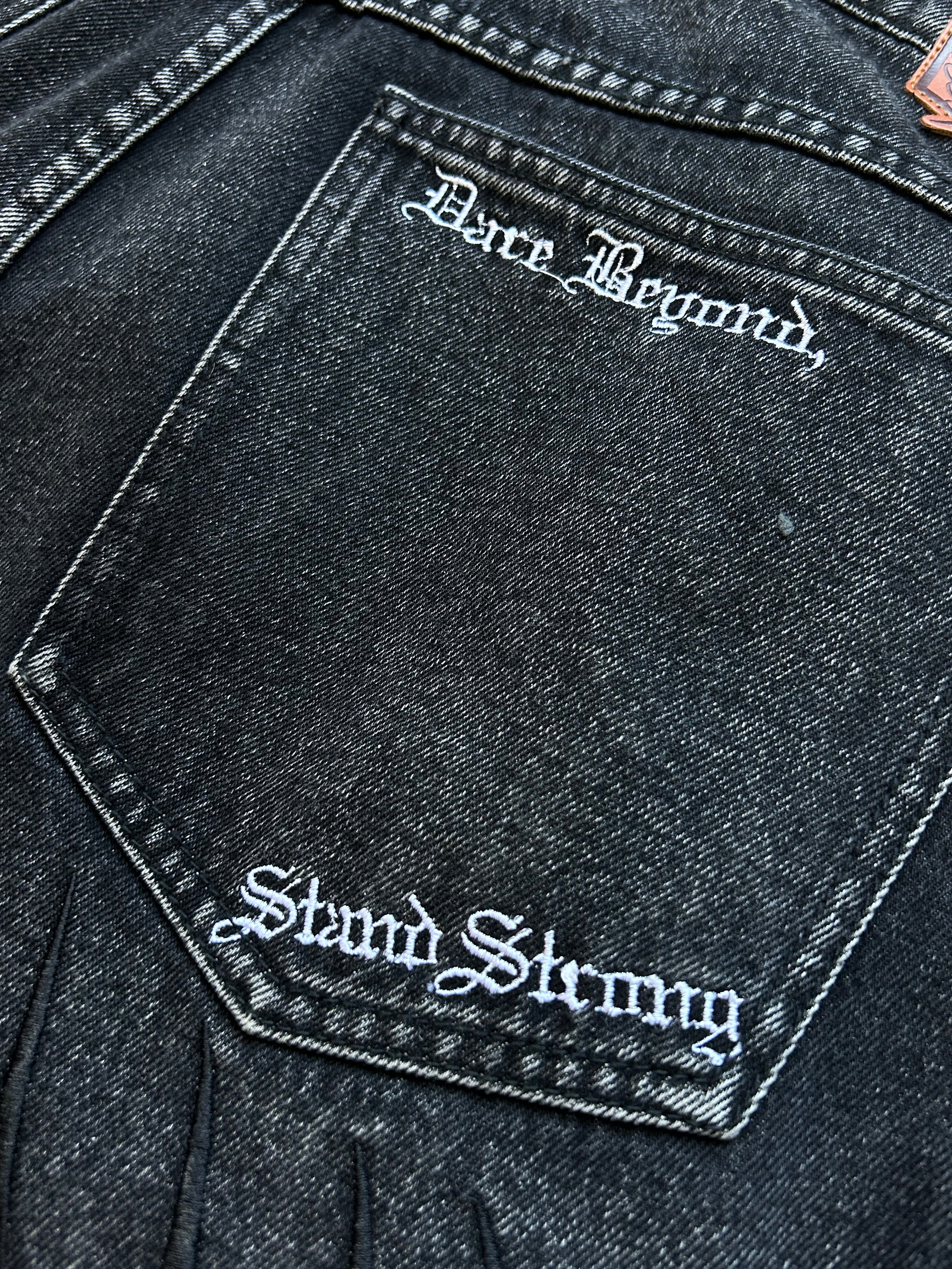 These pants are made of High-Quality Heavyweight Brushed Denim with screen-printed, puff print, and embroidery designs on the front and back. Very comfortable and warm. It will keep the color bright for a long time.